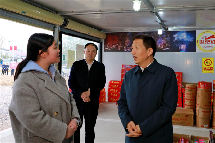 At the Xuantong Fireworks and Firecrackers Shop, Xu inspected the storage of fireworks and firecrackers as well as the allocation of fire-fighting equipment on site. He emphasized that it was necessary to effectively strengthen the safety risk prevention and control of fireworks and firecrackers, strictly implement the eight mandatory measures of the "Five Prohibitions and Three Musts", conduct in-depth investigations and rectifications of various risks and hidden dangers, effectively enhance safety supervision over all links including the production, transportation, sales and setting off of fireworks and firecrackers, and resolutely prevent accidents.