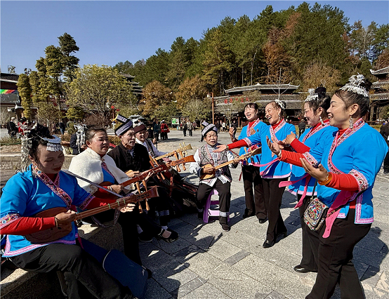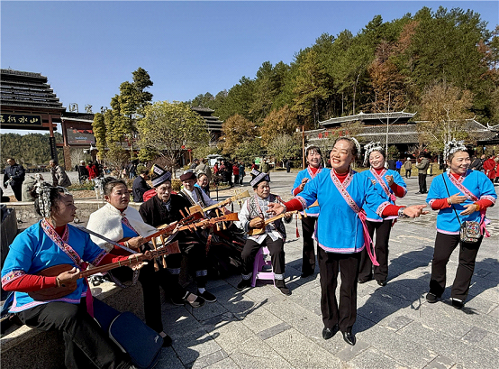 Nov. 27 — At Wanfoshan in Tongdao Dong Autonomous County, winter sunshine bathed the scenic area as residents and visitors savored a leisurely, pleasant afternoon. With clear skies continuing for days, locals and tourists have been stepping outdoors to enjoy the winter sun. The park was lively yet unhurried: music lovers brought their own instruments to sing and play, their lilting melodies blending with the warm sunlight and adding an air of refinement. People embraced the comforts of winter in ways both active and restful, finding simple pleasures in the season.