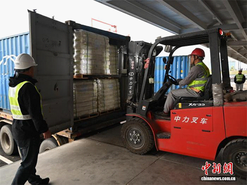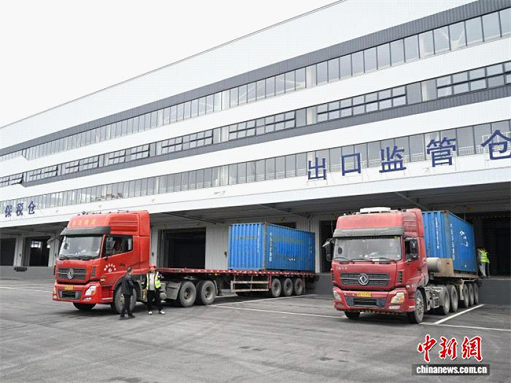Staff unload goods at the export-supervised warehouse. (Photo/Zhang Zhuo)