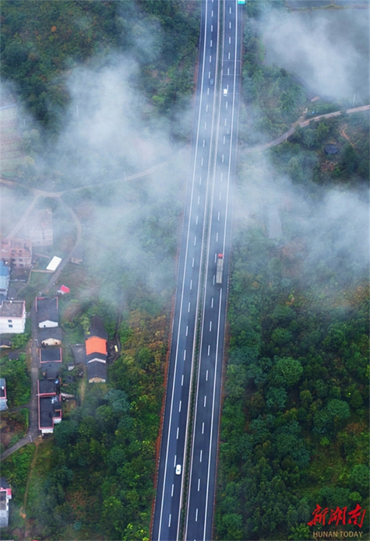 The photo, taken on November 3, shows vehicles running along the Tushi Town section of Xiamen-Chengdu Expressway in Lanshan County. In recent years, the county authority has intensified efforts to develop transportation infrastructure, optimized the layout of urban and rural roads, and developed a multi-dimensional transport network connecting expressways with national highways, provincial highways, and rural roads. These initiatives provide robust transportation support for high-quality economic development. (Photo/Huang Chuntao)