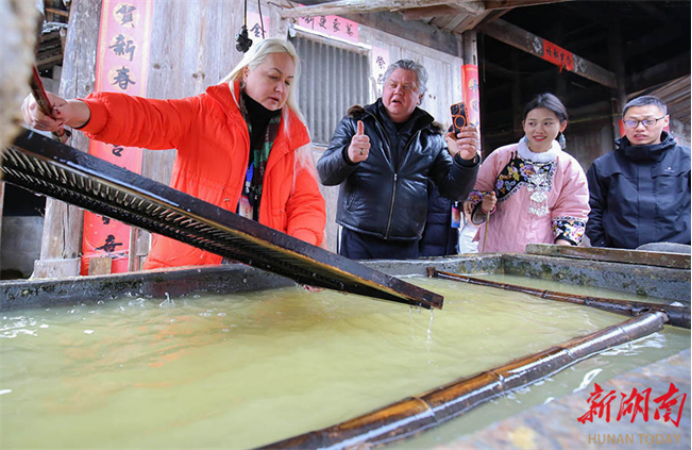 Foreign tourists try out the Tujia paper-making craft at Dongkan Village, Lingxi Town, Yongshun County. In recent days, the county organized a series of Tujia-style events to celebrate the Spring Festival. Many Chinese and foreign visitors were captivated, immersing themselves in the unique cultural charm of Chinese New Year traditions. (Photo/Zeng Yong and Xiang Feiqin)