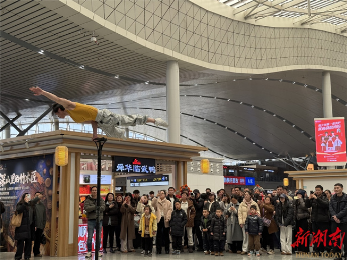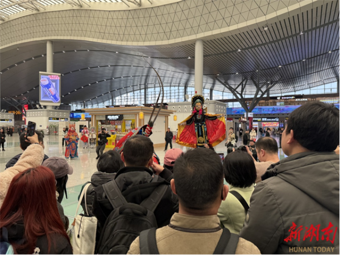 A variety of live folk performances like puppet shows, dramatic "face-changing," and acrobatics were staged to captivate the travelers. Six performers dressed as the mythical "Ne Zha" riding on "wind-and fire wheels" wove through the crowd handing out the Chinese character "Fu," symbolizing blessings. "I simply can't get enough of it, but I have just two minutes left to catch my train," remarked Mr. Wang, traveling from Changsha to Ganzhou. This was his first time experiencing Hunan's intangible cultural heritage performances, which he found fascinating. He looked forward to future opportunities to explore such traditions.